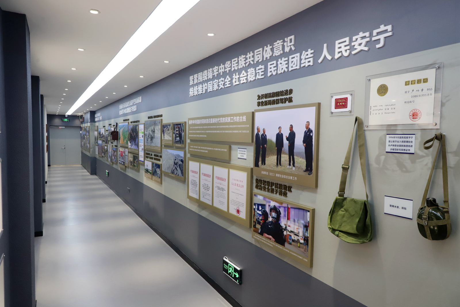 在展館的忠誠(chéng)警魂展廳“忠誠(chéng)奮進(jìn)走進(jìn)新時(shí)代”展區(qū),記錄了寧夏公安史上三件大事:第一件:護(hù)航保障百萬移民脫貧攻堅(jiān),交上中國(guó)減貧奇跡的“寧夏答卷”;第二件:全面推行黃河流域生態(tài)保護(hù)警務(wù)新機(jī)制,奮力譜寫中國(guó)式現(xiàn)代化寧夏篇章;第三件:緊緊圍繞鑄牢中華民族共同體意識(shí),持續(xù)維護(hù)國(guó)家安全、社會(huì)穩(wěn)定、民族團(tuán)結(jié)、人民安寧。